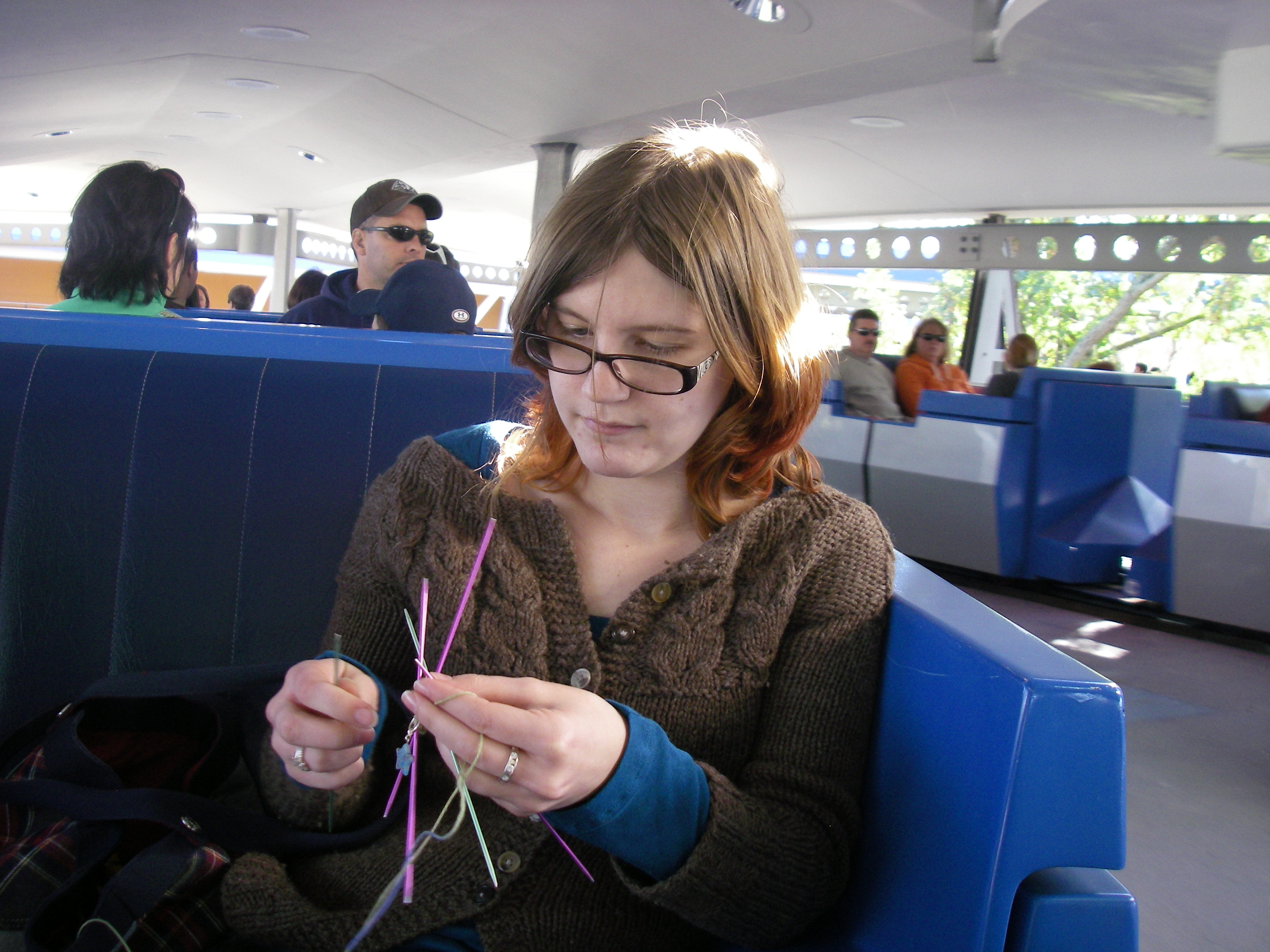 I have also knitted in amusement parks. My family is big on Busch Gardens (I go a lot in the summer and until March had a Platinum pass) and Disney World (my grandparents work there now, so we get free tickets, but we’ve been staying at the Disney-owned campground at least once a year since before I was born). I don’t know how familiar you all are with the Magic Kingdom, but I love knitting on the People Mover: