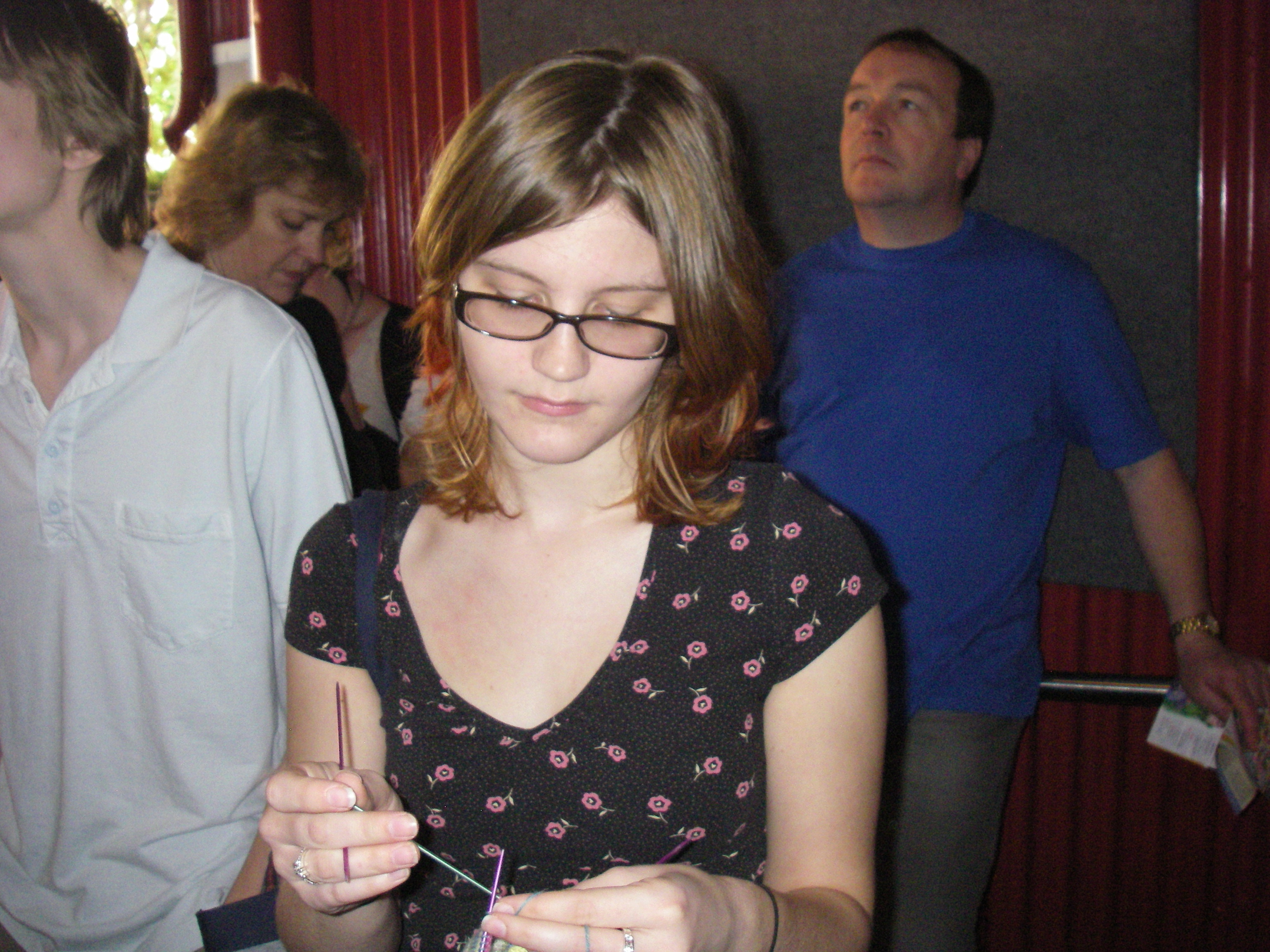 I have also knitted a variety of other places. I’ve knitted in class, for example. I knit in most of my discussion classes–I get antsy if I’m not doing something with my hands, and knitting is a lot more productive than doodling (as I’m sure you all know). I’ve also knitted in the car. Again, idleness makes me antsy, so I knit if I’m going to be in the car for more than two minutes (though I’ve been known to pull out a wip for the mile-drive to the 7-11 up the street).