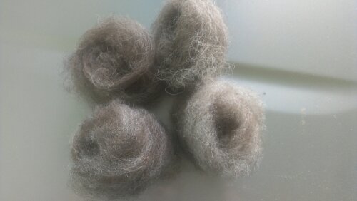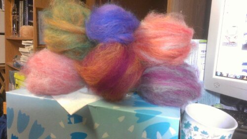 Little birds nests of fluffy fiber. Each one is only a couple grams. Not enough to do anything with. All six of these together is less than an once. But they’re so fast and fun to make. And the colors!