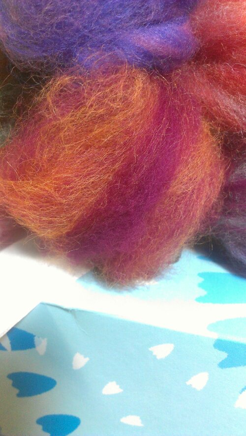 I wanted color. I pulled out this fiber, 4 oz of corriedale from Lakehouse Loft (on Artfire):