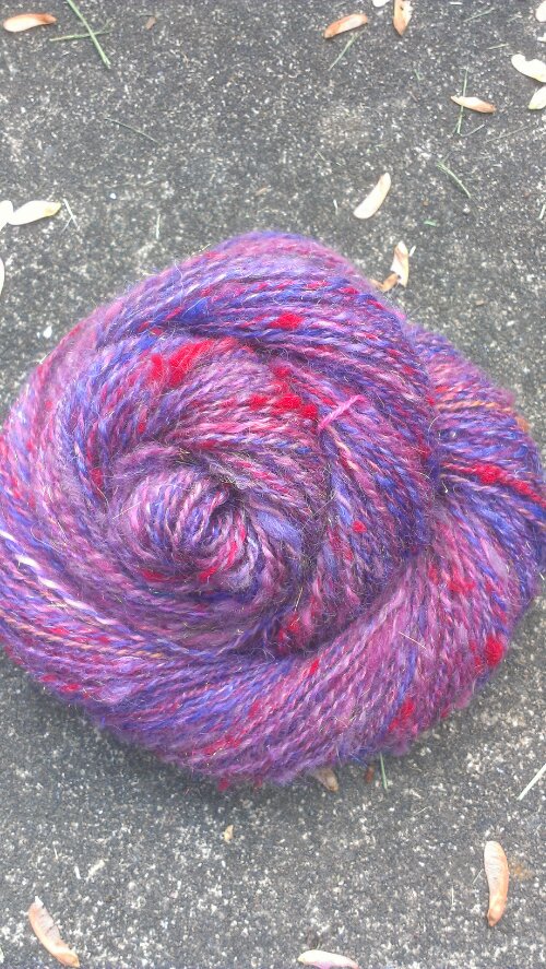 It came out more or less exactly as intended–a heavy sport/light dk two ply with decent yardage. I got 240 yards and it did puff up a little in the wash. I spun it woolen with a short forward draw.