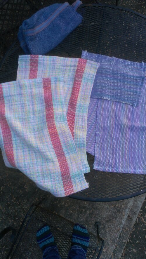 After hemming, most of these came out shorter than I wanted. Next time I’ll do a longer warp and think beforehand how long I want them to be before just cutting the fabric in half. I’m still very new at weaving, but this is more to do with my impatience as a sewer. (Sewist? I’m certainly not a sewer.) I need to work on that, especially since I want to work on getting better at sewig. Probably not garment making, but certainly garment fixing. I’d like to be able to make a corset.